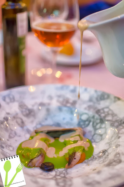 Y para finalizar, otro plato de pescado. En esta ocasión fue "Dorada del mar menor, con una crema de calabaza totanera, suquet de ajo negro y espuma de pepino". Si el anterior había sido una batalla, este es una guerra, fué muy curioso, el pescado sabrosísimo, pero cada uno de los presentes le quitaría algo al plato, se oían cosas como "la crema está tremenda, pero la espuma no me gusta", a lo que respondía "pues a mí la espuma me encanta, pero el suquet no me convence", y así todo el rato mientras nos lo comíamos... así que no sabría deciros muy bien la conclusión de este plato, lo único, que yo soy de las que opinaba que lo único que le sobraba era la crema de calabaza.