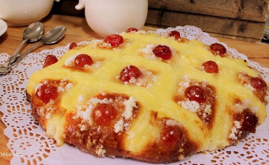 Julia nos propone desde su blog, Julia y sus recetas, esta otra versión muy clásica, la coca de brioche con crema pastelera, con sus guindas y su azúcar por encima es otra de las preferidas para la noche de verbena, si quieres preparar un surtido de cocas de San Juan esta no puede faltar, ¡y lo rica que está!