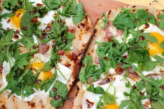 Prueba las últimas obsesiones de la comida juntas: pizza, huevos, rúcula y salsa balsámica. ¡Realmente no puedes equivocarte con todos estos alimentos! En forma de pizza, son celestiales.