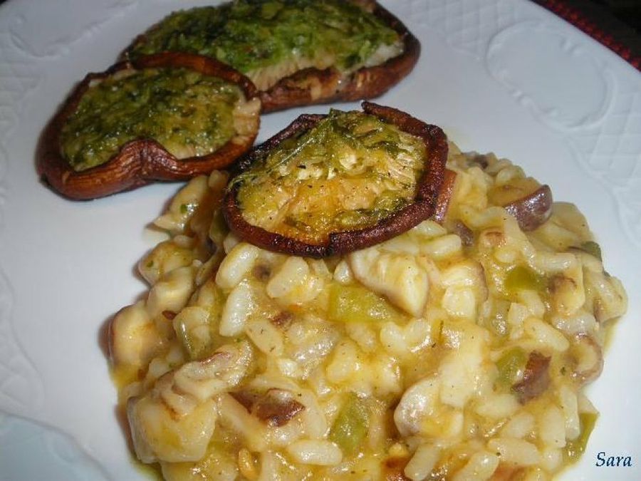 Primero hacemos el risotto. Picamos finito la cebolleta y el pimiento y en una sartén los pochamos. Cuando esté blandito echamos las setas picaditas y el arroz, y vamos añadiendo con la ayuda de un cucharón el caldo de verduras que ya tendremos preparado y casi hirviendo. Removemos y dejamos que se vaya absorviendo, y volvemos a repetir la operación del caldo de verduras hasta que el arroz esté en su punto.