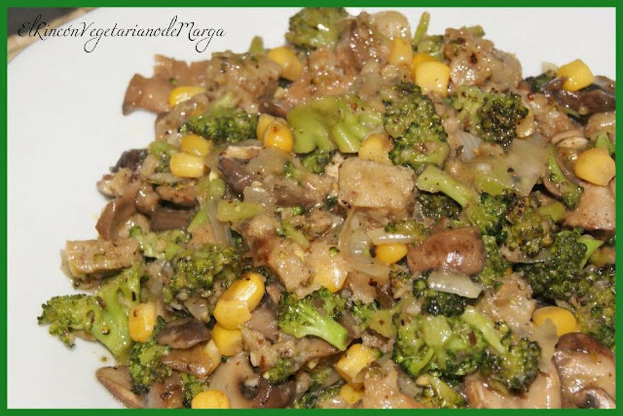 Wok de brócoli, shiitake, maíz y seitán (Receta e imagen de nuestra amiga marga2387)
