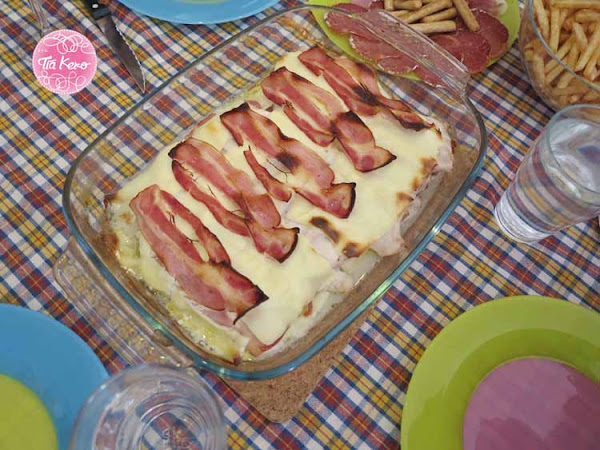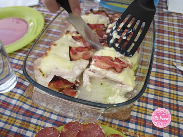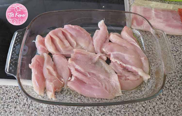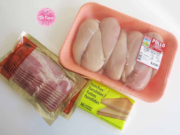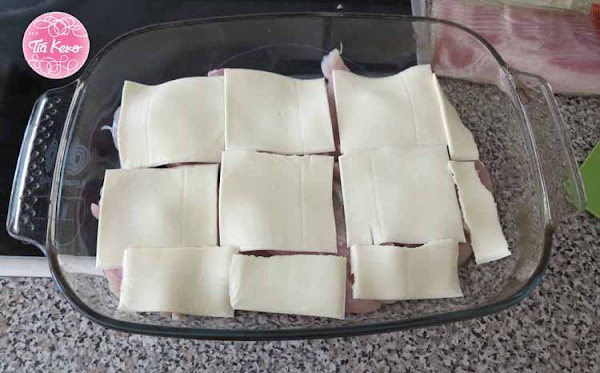 A continuación ponemos una capa de filetes de pollo, una capa de lonchas de queso y una capa de bacón, y repetimos todo el proceso otra vez hasta que tengamos los pisos que queremos de carne, queso y bacón. Nosotras no solemos poner más de tres pisos.
