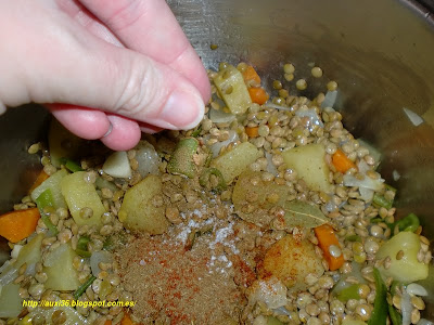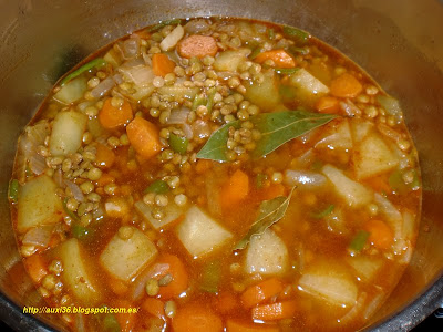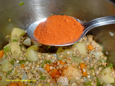 Lentejas,patata,zanahorias,pimiento verde,ajo,cebolla,tomate,pimentón dulce,aceite de oliva y sal