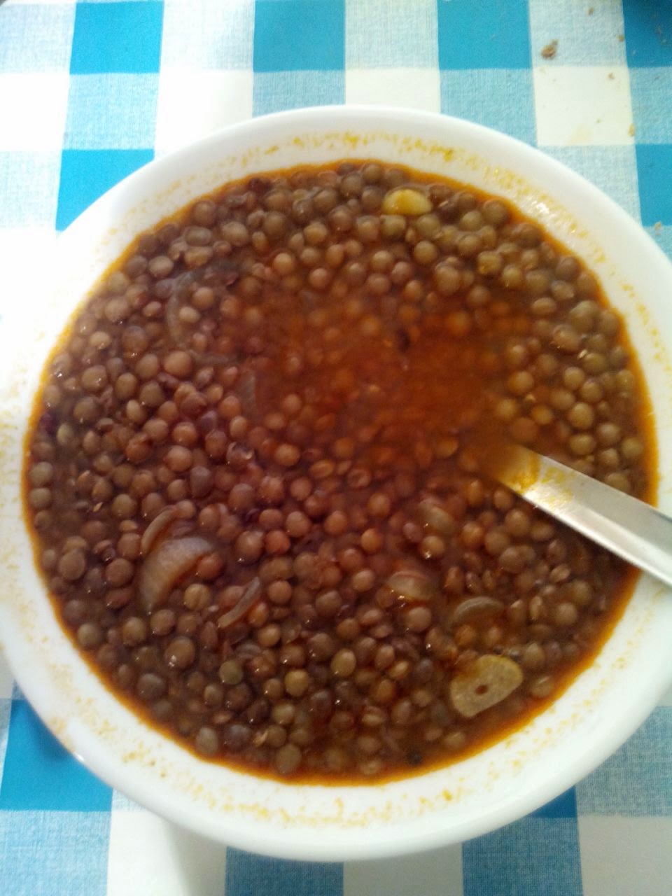 Al día siguiente,cocemos las lentejas a fuego medio durante una hora con el laurel y la pastilla de caldo de verduras.