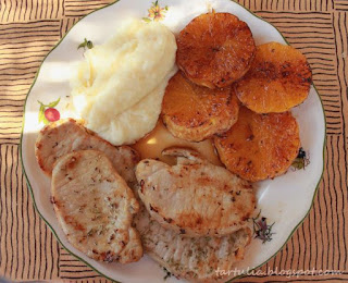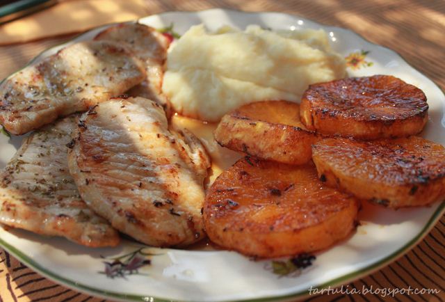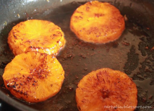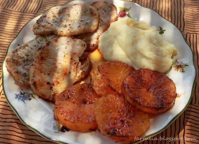 En el mismo aceite sofreímos la naranja rápidamente, vuelta y vuelta, veremos que se tuesta un poquito. Colocamos en los platos a modo de guarnición y adornamos con el puré.