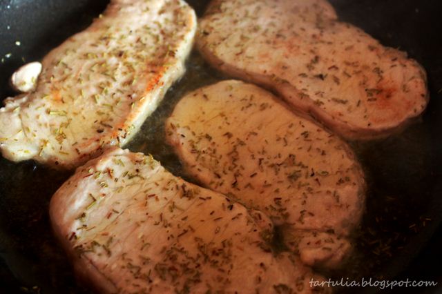 Salamos y espolvoreamos romero picado sobre el lomo y pasamos por la sartén friéndola con poco aceite, colocamos en los platos.