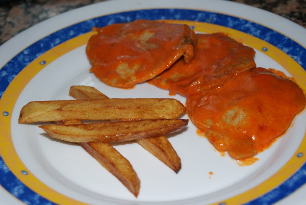 - Ponemos la salsa en la base, los filetes encima y echamos un poco mas de salsa por encima de los filetes, adornamos con perejil y a comeeeeeeer