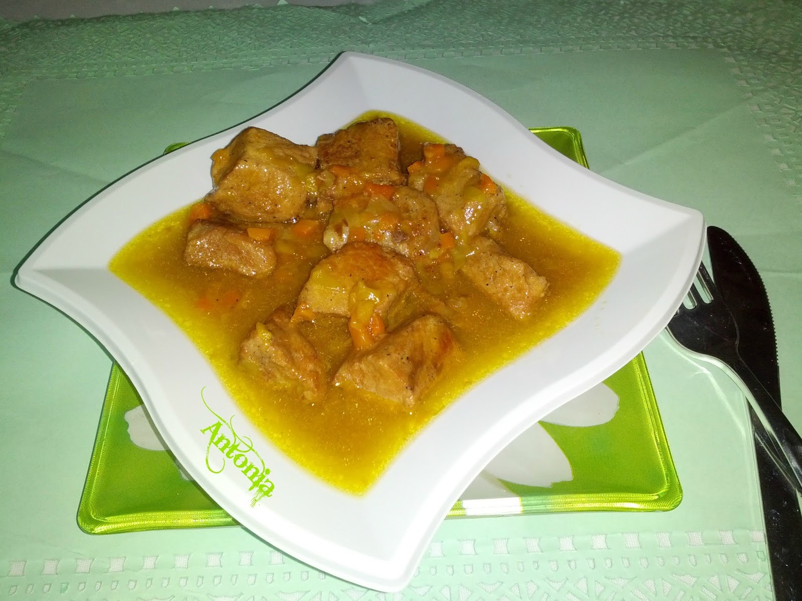 1/2 kl. lomo ibérico , 1 melocotón , 1 zanahoria , 1 puerro , medio vasito de vino Pedro Ximenez , caldo de pollo , o de carne casero , sal , pimienta molida , ajo en polvo ,aceite