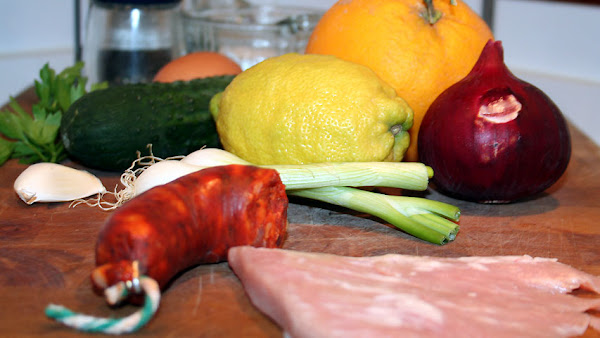 Ingredientes:Naranja (1)Limón (1)Pepino (1)Cebolleta (1)Cebolla roja (1)Ajo (2)Chorizo (1)Carne de cerdo -yo he usado secreto- (100 gr)Aceite de olivaVinagre de JerezSalPimienta negraPerejil frescoHuevo (2)Preparación:Pela y saca los gajos a la naranja y al limón. Introduce los gajos en un bol.Limpia el pepino, quítale los extremos. Córtalo a lo largo por la mitad y saca "medias lunas". Incorpóral ...