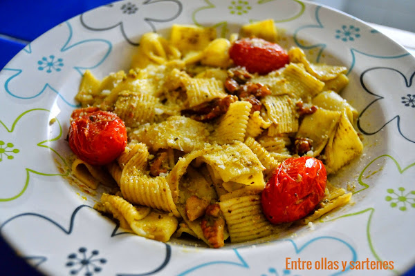 Ingredientes:400 g de cintas al huevo12 tomates cherry50 de nueces peladas1 bote de salsa pesto verdeAceite de olivaSalPonemos la pasta a cocer en agua hirviendo con sal, el tiempo que nos indique el paquete.En una sarten echamos el aceite y sofreimos los tomates cherry enteros una vez esten pochaditos añadimos las nueces peladas y picadas y doramos un poco.Cuando la pasta este cocida, la colamos ...