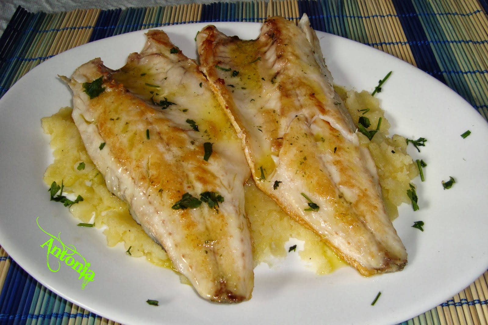 patatas ELABORACIÓN :{:} Cocemos unas cuantas de patatas , las pelamos en caliente y las chafamos con un tenedor le añadimos una poca de sal y pimienta molida, le añadimos algo aceite y movemos muy bien , ponemos en la batidora 8 cucharadas de aceite una cucharada de zumo de limón medio ajo algo de sal y perejil un poco, batir bien . Ponemos las lubinas a la plancha por la parte de la piel primero y dándole unos cortes para que no se encojan , una vez que las tenemos echas las emplatamos encima de una cama de patatas y la salsa de ajo y aceite,un buen plato sencillito y muy sano