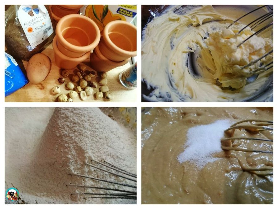 2.- Lavamos bien los molde, los secamos y engrasamos con mantequilla. Esparcimos por encima un poco de harina. Repartimos la masa en moldes, llenamos hasta el borde. Cocinamos con el horno precalentado a 180ºC 30 minutos.