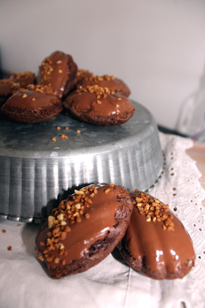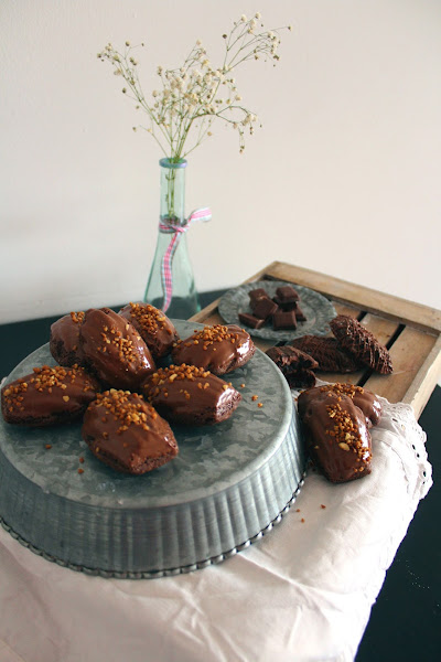 Para la cobertura de chocolate, fundimos el chocolate en el microondas, a temperatura baja y poco a poco. Removed de vez en cuando para que no se os queme. Para que nos sea más fácil bañar las madaleines, le añadí una cucharadita de aceite de girasol o vegetal, para que tenga más fluidez. También podéis añadir manteca de cacao. Bañamos las madaleines, espolvoreamos avellanas crunch y dejamos secar sobre una rejilla. Y listas para degustar!!!