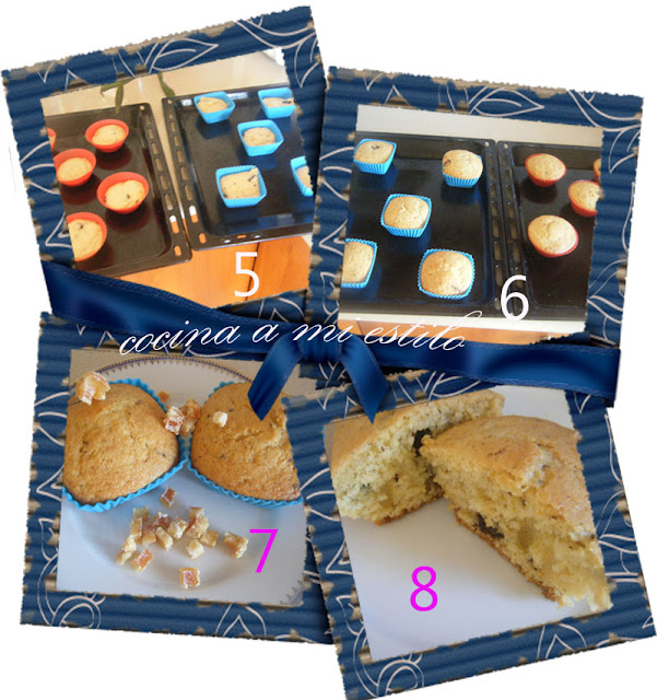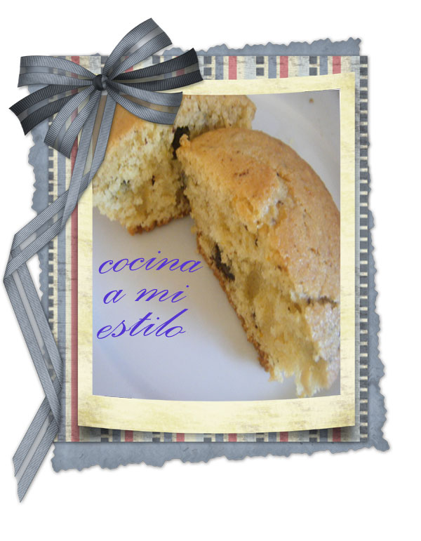 1 huevo,160g de azucar,Zumo y ralladura de una naranja,50g de peladura de naranja confitada,50g de pepitas de chocolate,1 sobre de levadura,300g mas o menos de harina,60ml de aceite,60ml de leche1- mezclar todos los ingredientes salvo la harina y la levadura