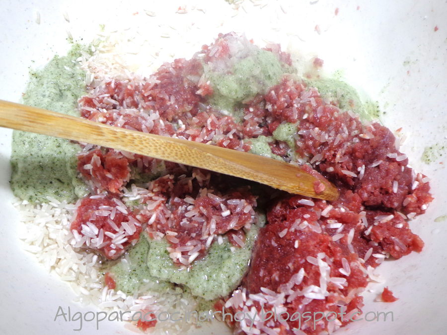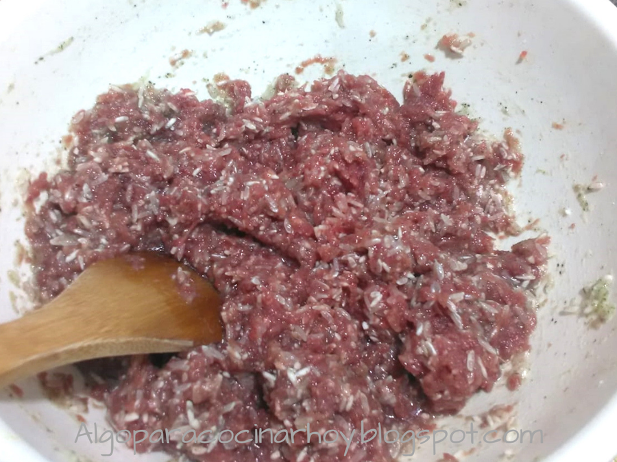 En un bol colocamos la carne el arroz previamente lavado, la sal el condimento licuado la pimienta y el aceite mezclamos muy bien hasta obtener una mezcla homogénea.