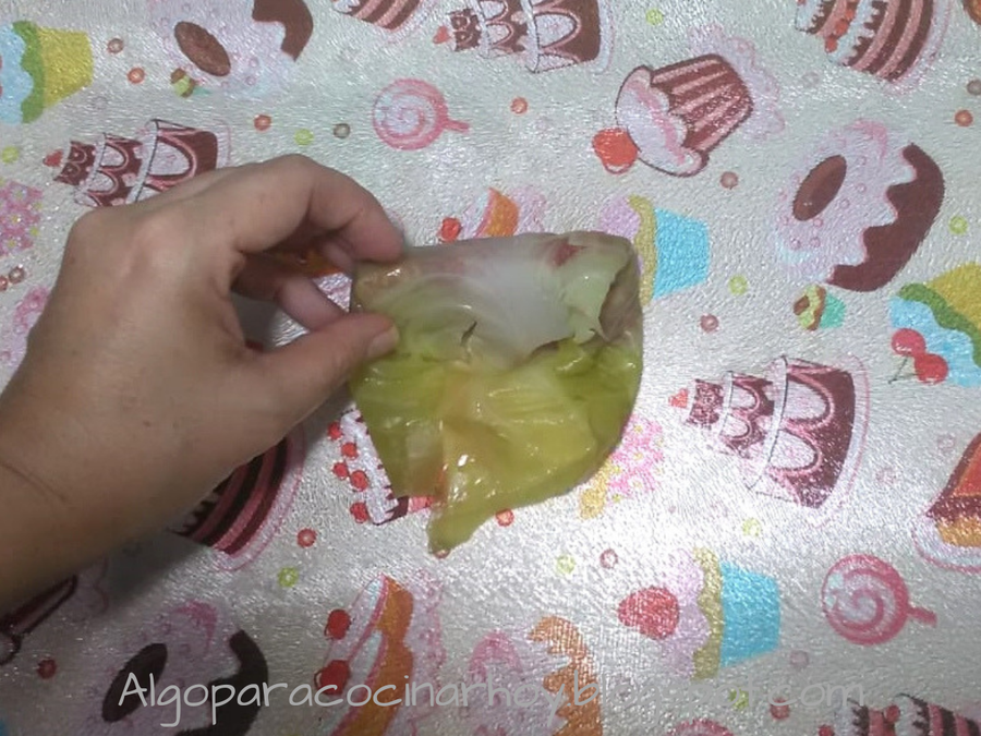 Una vez cocinadas las hojas de repollo retiramos la parte gruesa de la nervadura de cada hoja cuidando no romperla. Todos los restos de repollo vamos a reservarlos para colocarlos en el fondo de la olla al cocinar.