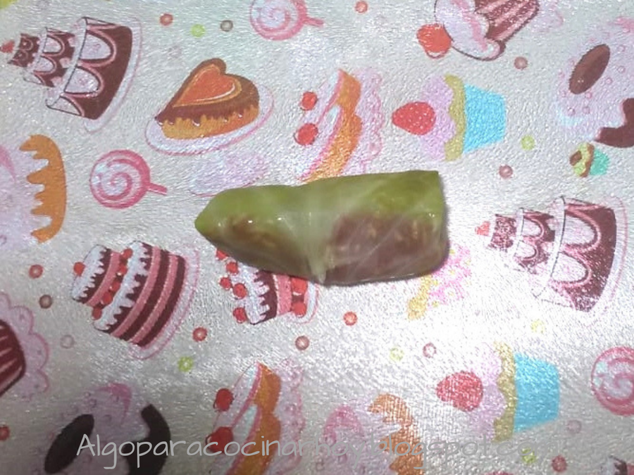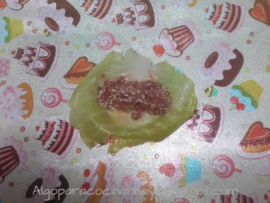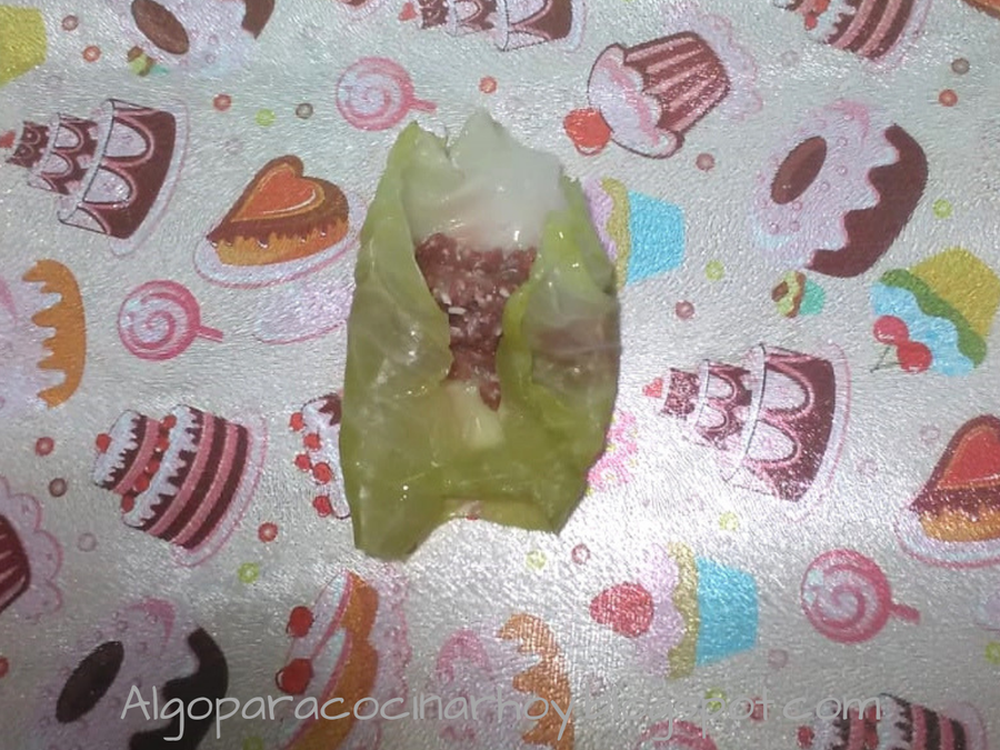Para elaborar los indios, tomamos una hoja de repollo ya arreglada y colocamos en el extremo superior un poco de la mezcla con carne lo extendemos con nos muestra la primera imagen de las instrucciones de armado, entonces doblamos los laterales y enrollamos.