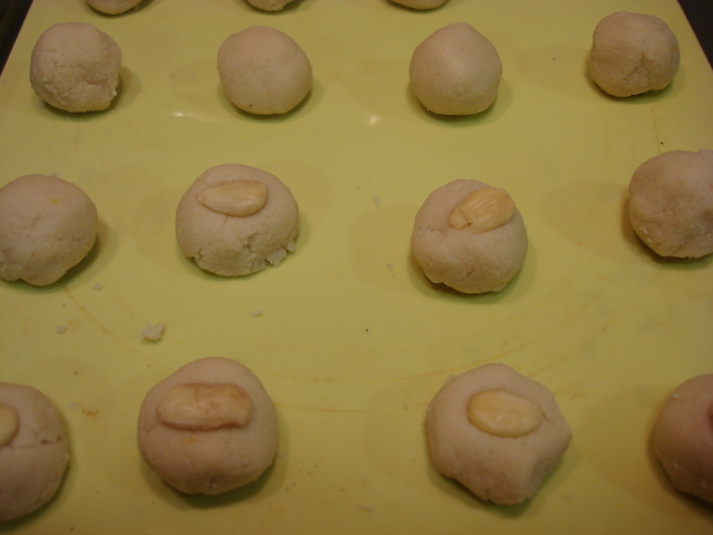 En el centro de cada bolita colocamos una almendra cruda, y presionamos con el dedo. Lo justo para que la almendra se pegue, no hace falta que la metamos hasta la mitad...