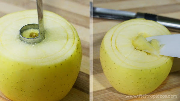 Ahora vamos a descorazonar la manzana. Si tienes descorazonador, mucho mejor, porque el corte es más limpio y queda más bonito. Pero si no tienes, puedes hacer con un cuchillo. Saca las semillas penetrando con el descorazonador hasta la mitad de la fruta.