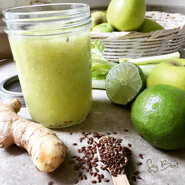 En una licuadora o procesador de alimentos ponemos una manzana en trozos, 1 o 2 ramitas de apio ,también cortada en trozos, 2 a 3 rebanas de jengibre fresco (pelado) 3 cucharaditas de linaza, el jugo de un limón y tu endulzante