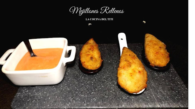 7. Rellenamos con la ayuda de una cuchara las cascaras de los mejillones