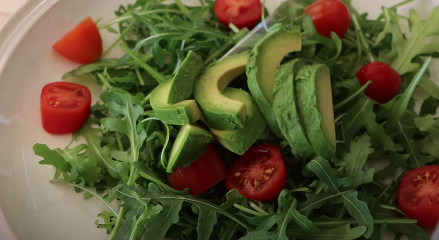 2. Coloque la rúcula, los tomates, los tomates secos y el aguacate en un plato.