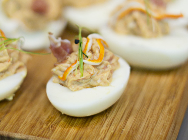 Allí también podéis ver mejor como se hacen, picamos todos los ingredientes, los mezclamos y rellenamos los huevos, los adornamos con brotes tiernos y listos para servir.