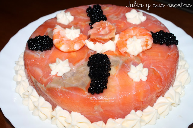 Necesitamos salmón ahumado, gambas, merluza, huevas de lumpo, mayonesa, cebolleta y algunos ingredientes mas que podéis ver en mi blog Julia y sus recetas.