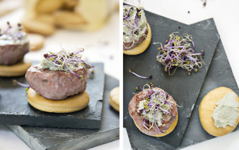 Mezclaremos las carne con los ingredientes de la hamburguesa y haremos pequeñas bolas que pasaremos por la plancha. Untamos las galletas con el cabrales y colocaremos la hamburguesa encima y adornaremos con brotes tiernos...