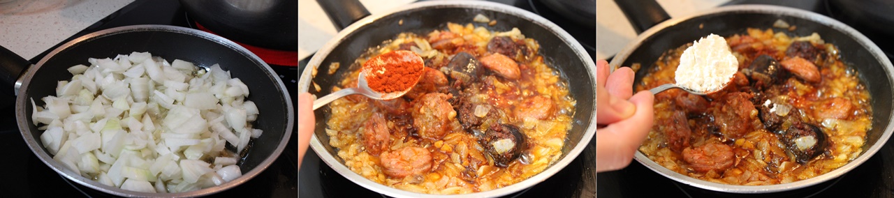 Cuando esté todo sofrito, añadimos el chorizo en trozos y la morcilla en rodajas gruesas para que no se desmorone , le añadimos una cucharadita de harina y el pimentón, removemos todo bien y sofreímos un minuto más y se lo añadimos a los garbanzos junto con los callos cocidos y un buen manojo de hierbabuena. Yo los he comprado ya cocidos, pero podéis cocerlos vosotros en casa...