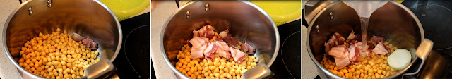 Los vamos a hacer en olla exprés, por lo que tenemos que poner dentro de la olla, los garbanzos remojados y escurridos, 1/2 cebolla, 3 dientes de ajo enteros con su piel, el hueso de jamón, la panceta salada, el laurel, sal y agua hasta cubrirlos. Los dejamos cocemos durante 30 minutos desde el momento en que empiece a girar la válvula.