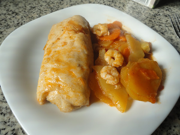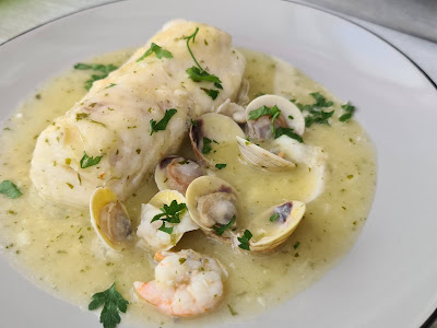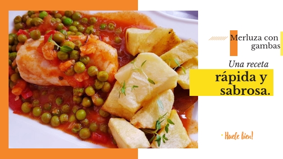 Vamos acomodando en la sartén, la merluza salpimentada la dejaremos 3 o 4 minutos y ponemos las gambas y un poco de perejil .