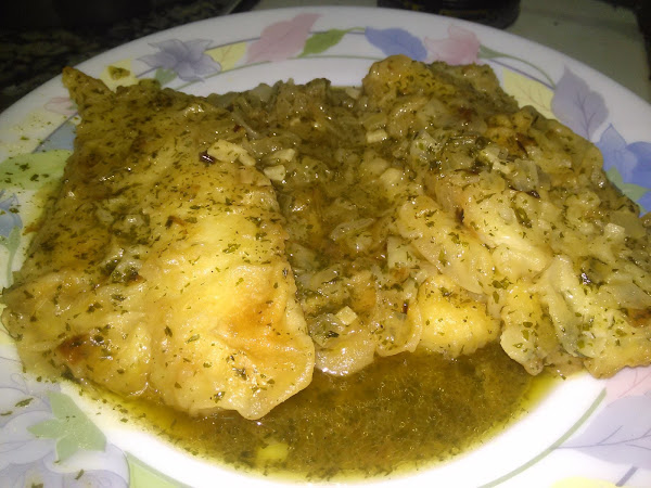 En ese mismo aceite rehogamos los ajos y la cebolla, cuando esté doradito añadimos la cucharada de maicena y la integramos, añadimos el vino blanco, el agua,el perejil y sal ( a nuestro gusto) y cocemos hasta que la salsa espese, si la salsa quedara muy espesa añadiríamos un poco más de agua.
