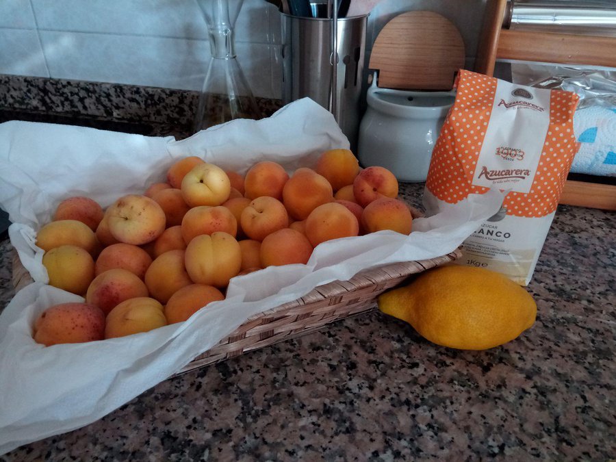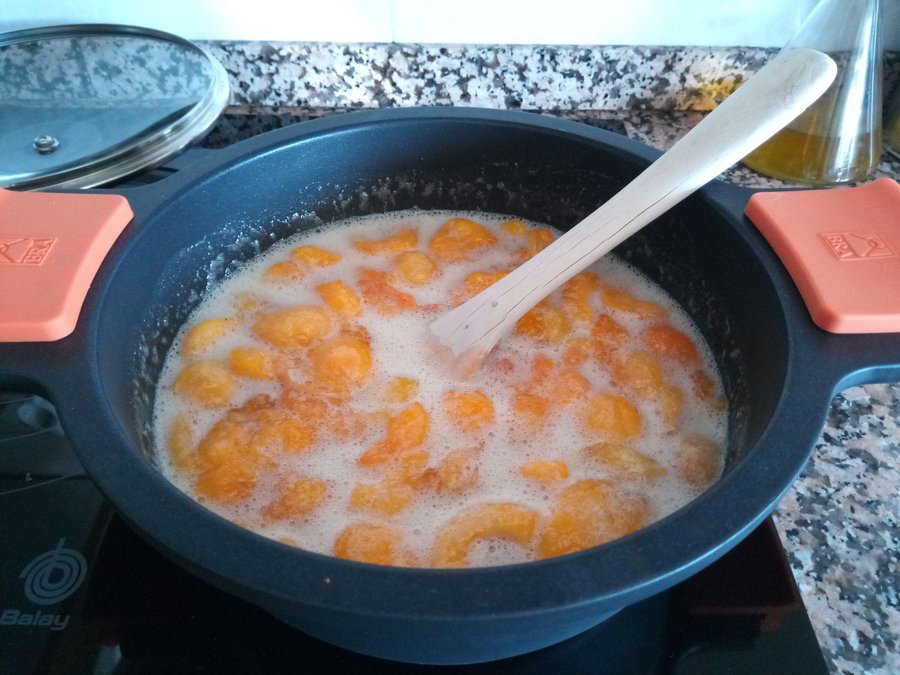 Nunca pelo los albaricoques, ya que así queda más consistente la mermelada, pero sí que los lavo muy bien. Los parto por la mitad y les retiro el hueso. Entonces los pongo en una cazuela con el azúcar y el zumo de limón y los dejo reposando por lo menos una hora para que maceren.