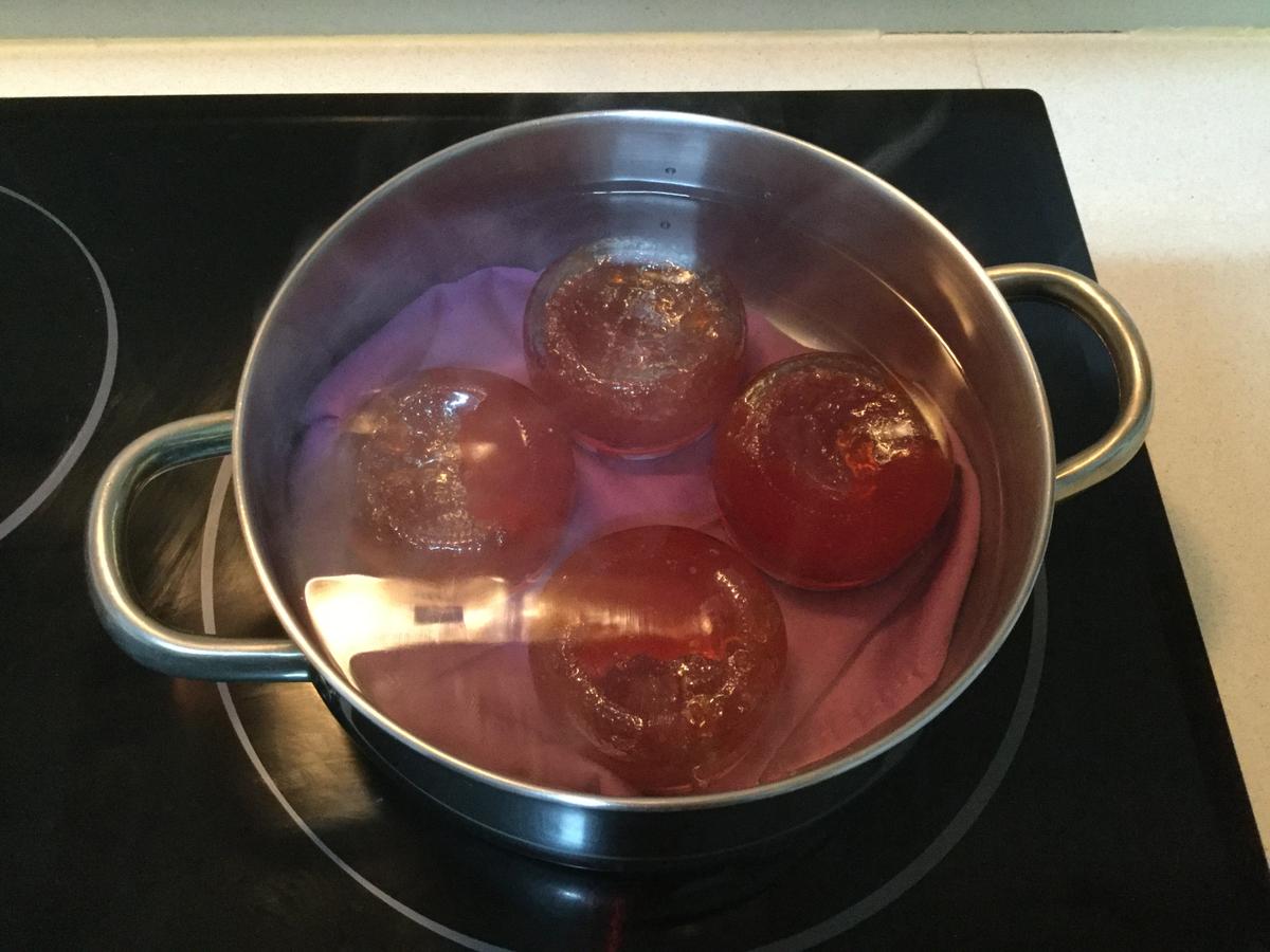 Ponemos dentro de una olla, en el fondo, un paño sobre el que pondremos los tarros boca abajo y cubriremos con agua para luego llevarlos a ebullición durante unos diez minutos. A ver, yo aquí como soy una exagerada, los tuve veinte, pero no creo que sea necesario tanto.