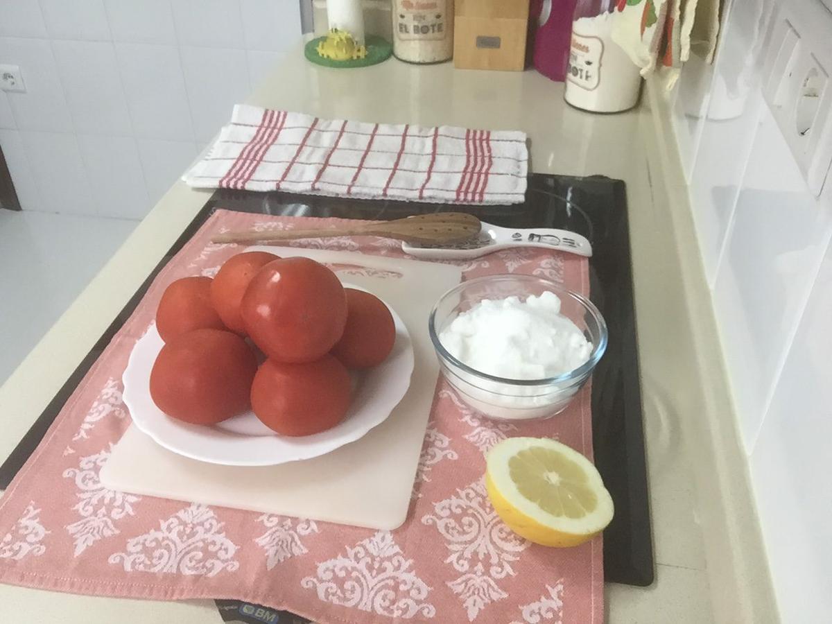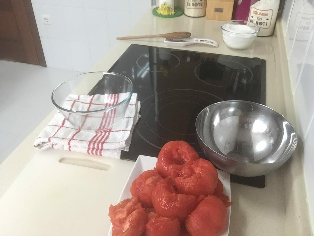 Disponemos los ingredientes ya pesados y con los tomates bien lavados.