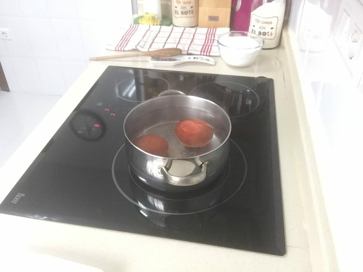 Cuando esté muy caliente pero sin llegar a hervir, cogemos un tomate al que habremos quitado el tallo, lo giramos y con un cuchillo, en la base, le hacemos dos cortes poco profundos en forma de cruz y lo sumergimos en el agua, apenas dos minutos.