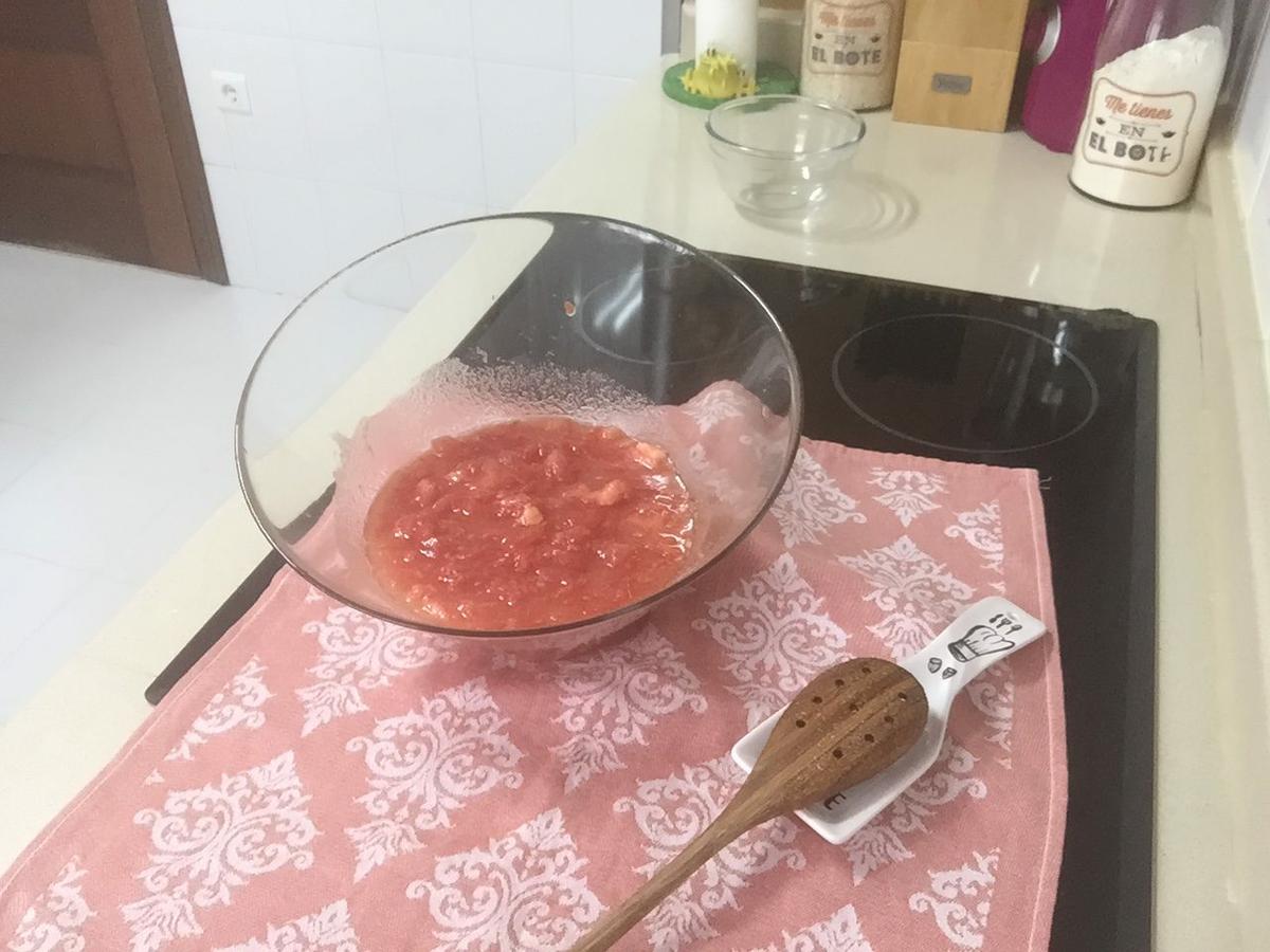 Este es el aspecto que tiene nuestra mezcla después del tiempo de macerado. El tomate ha liberado un montón de agua y lógicamente pierden volumen las tiras que hicimos.