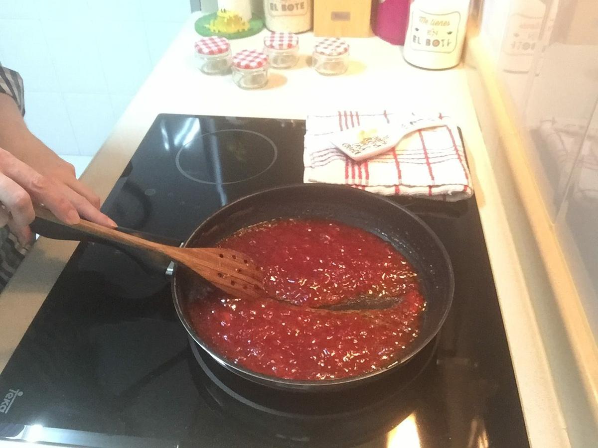 Tenemos que remover constantemente con una cuchara de madera para que no se pegue el tomate al fondo de la sartén. Seguiremos un buen rato hasta que veamos que al pasar la cuchara por el diámetro de la sartén queda marcado un rastro.