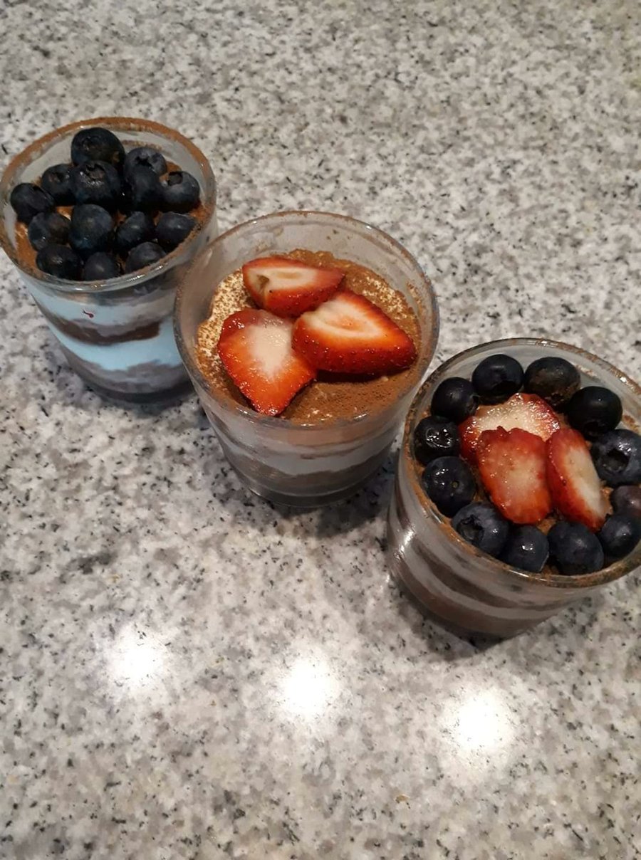 El bizcochuelo lo cortas en discos del tamaño del envase, colocas el primer disco lo humedeces con el jugo de chocolate, agregas la crema anterior y espolvoreas con cacao en polvo, así sucesivamente continuas con los discos de bizcochuelo hasta terminar en crema, finalmente espolvoreas con cacao. Lo dejas reposar en la nevera por lo menos 2 horas para degustarlo. En el caso del tiramisú con frutas, simplemente entre capas, incorporas las frutas que más te gusten, yo opte por arándanos, fresas y cerezas, porque le dan un contraste maravilloso al postre. Así que puedes optar por la fruta de tu preferencia.