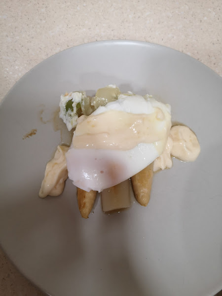 10 El huevo escalfado es muy fácil de preparar, solo tenemos que poner un poco de film en un vaso pequeño y añadimos un poquito de sal y aceite en el centro , rompemos el huevo sobre este film . Cerramos bien con una cuerdita y los cocemos en abundante agua , en 5 minutos los tenemos ya en su punto ..
