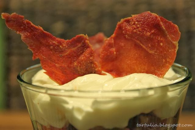 Decoramos al gusto, en mi caso con tiras crujientes de jamón secadas el microondas entre dos papeles encerados