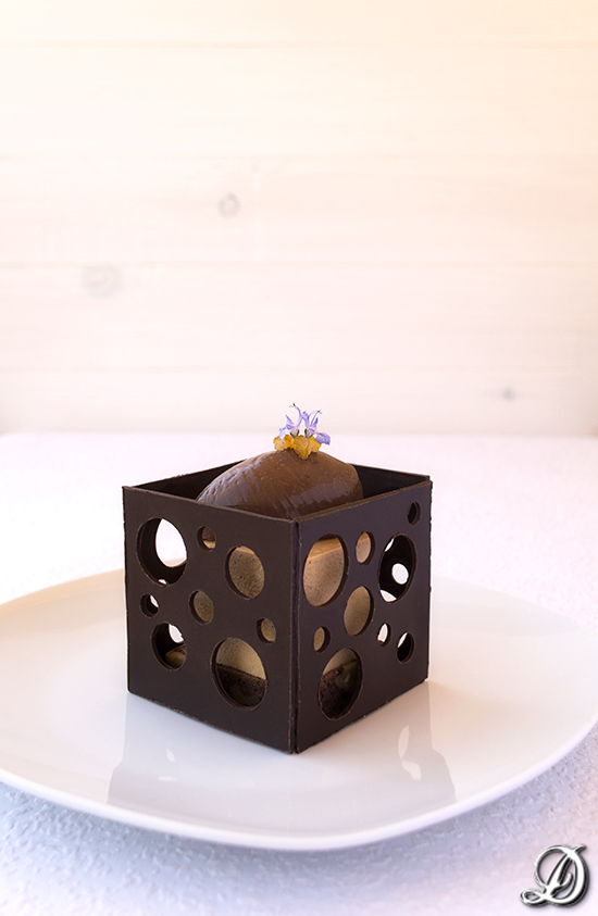 En esta ocasión yo me he decantado por utilizar la piel porque buscaba toques más aromáticos. El postre que os traigo hoy consiste en unas bases crujientes de sablée de chocolate rellenas de ganache de chocolate y Grand Marnier (licor), después para darle una presentación más original lo que he hecho ha sido ponerlas de lado para después colocar una ganache montada de naranja por encima, finalmente he decorado con unos dados de naranja confitada y unas hojas de menta.