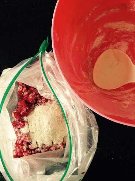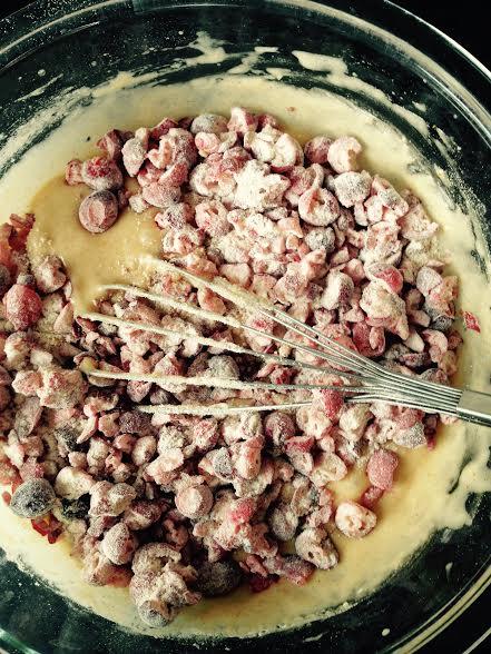 Si quieres introducir trocitos de fruta fresca en tus bizcochos o cupcakes, yo lo aprendí a hacer de la siguiente manera: trocea la fruta (lavada) que quieras usar (fresas, frambuesas, arándanos…) en trozos no muy grandes, después mételos en una bolsa de congelar y congélala. Quince minutos antes de incorporar la fruta al bizcocho le metes en la bolsa una cucharada de la harina indicada en la receta, agita bien y vuelves a congelar hasta que la vayas a utilizar. Esto ayuda a repartir bien la fruta por la masa y evita que se quede en el fondo durante el horneado. Y la proporción de fruta debe ser 50 gr de fruta troceada por 120 gr de harina.