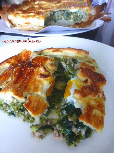 Elaboracion del relleno: Una vez cocidas y escurridas las espinacas las reservamos. Ponermos en una sarten aceite y pochamos el ajito y el puerro. Cuando ya casi esta añadimos las espinacas y lo mezclamos todo bien. Añadimos los piñones.