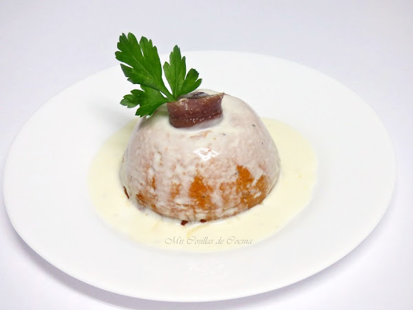 Servimos la mousse con un poco de salsa por encima y adornamos con un anchoa.