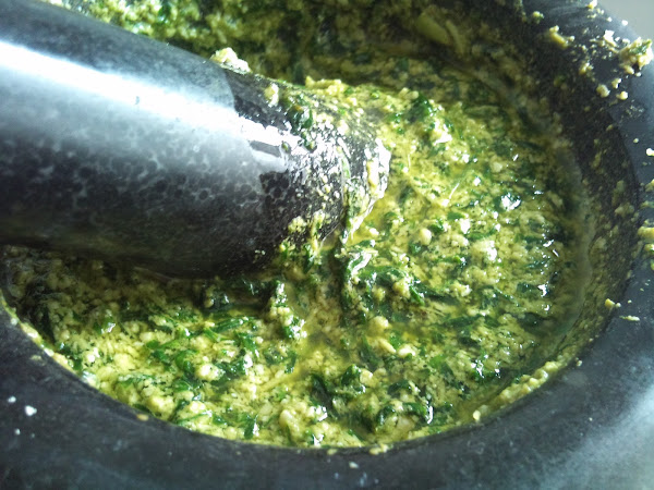La salsa pesto le aporta aroma y cuerpo al resto de ingrediente. Esta salsa es de origen italiano y se prepara con hojas de albahaca frescas molidas junto a los ajos, queso (suele usarse parmesano), un fruto seco (normalmente piñones pero también se es típico encontrarlo con nueces incluso con almendras) y el aceite de oliva. Un buen pesto no debe ser preparado en una batidora o procesadora de alimentos porque pierde su encanto al molerse “de más” los ingredientes. Yo lo he preparado en el mortero, machacando los ingredientes y he de decir que han conservado todo su sabor y textura. Pero entiendo que si se anda con prisas o no se dispone de mortero, se use la trituradora.