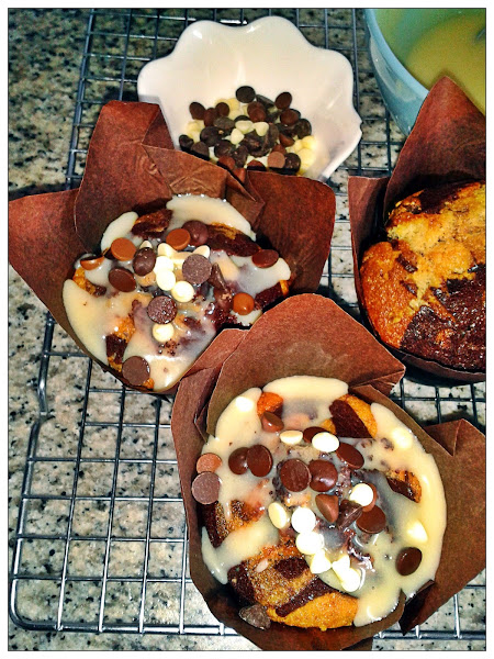 Holaaaa, hoy os voy a deleitar con la receta definitiva de muffins 3 chocolates o triple choc... Bizcocho marmolado de chocolate y vainilla, relleno de ganaché de chocolate blanco y chips de tres chocolates... la tentación hecha muffin!!! hay días que bien merecen un capricho así!!!