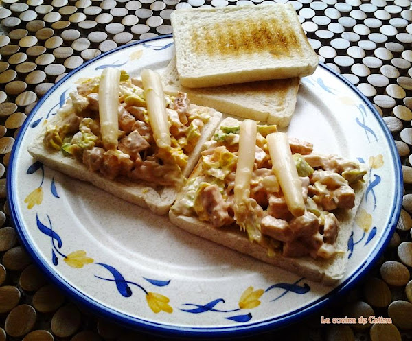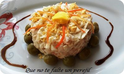 Una vez frío desmoldar, cubrir con mahonesa y decorar con zanahoria rallada y puntas de espárragos.