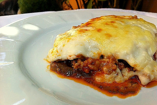 La primera que probé este plato me supo a gloria.Ingredientes para 6 - 7 comensales3 berenjenas medianas750 g de carne picada (ternera y cerdo)3 ajos1 cebollaEspecias: orégano, albahaca1/2 vaso de vino blancoAceite de oliva virgen extra4 tomates muy maduros4 cucharadas de tomate frito Bechamel Queso para gratinarSal y pimientaPreparaciónPela y corta las berenjenas en rodajas de medio centímetro, e ...